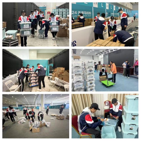 物品发放会现场,学院青年志愿者活跃在各个点位👩🏻🦼➡️。从会场布置、号码布分装发放、选手完赛物资的分装,到内外场引导、身份核验、芯片核验、物资装包发放、资料运输👩🌾🚵🏼♂️、人脸识别核验🖱💃🏻,处处闪现着他们忙碌的身影👨🏽🌾,志愿者们发挥专业所长,秉承热情周到、细致耐心的服务理念为选手们顺利参赛提供保障❤️,展现了天津青年青春蓬勃的朝气和良好精神面貌。