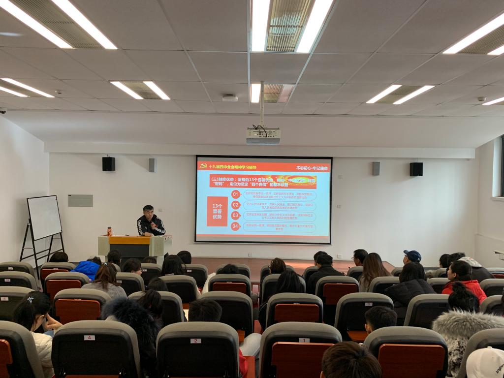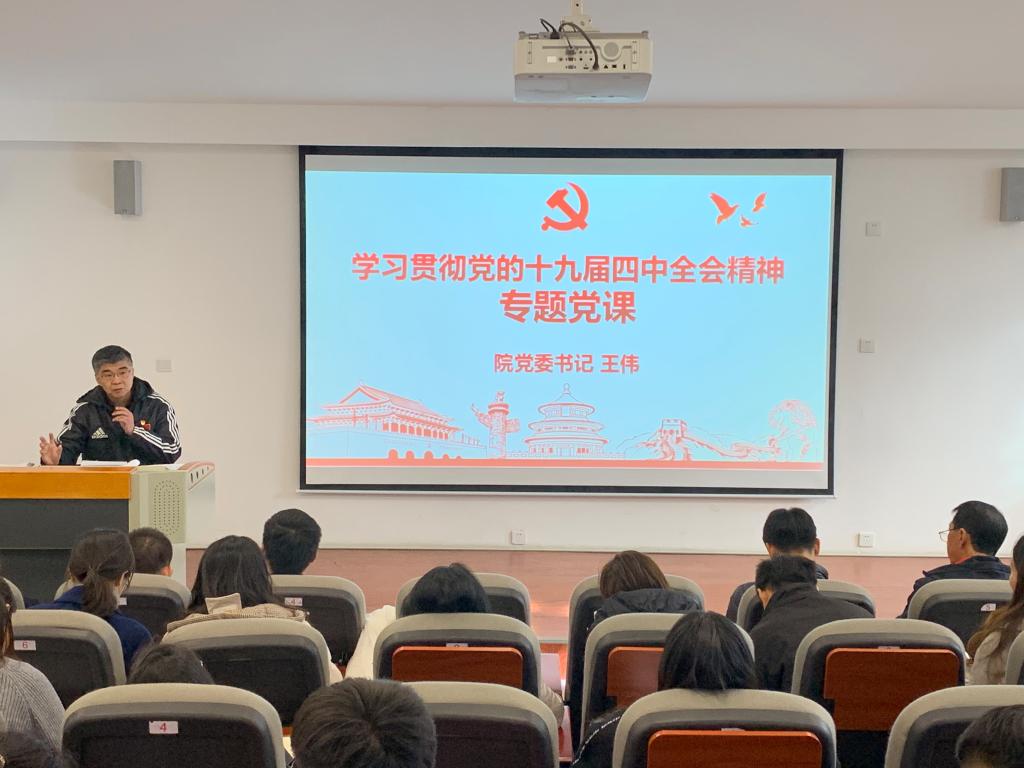 为深入学习宣传贯彻党的十九届四中全会精神👨🏽🍳,按照局党委、市委教育两委的部署要求👨🏼🍳,11月27日上午🏊🏼♀️🚵♀️,学院党委书记王伟在第一阶梯教室讲授党的十九届四中全会精神专题党课。院纪委书记沈茹劼、全体教职员工、部分团员干部和学生入党积极分子参会。