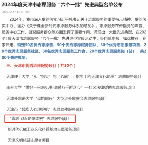 喜报 | 彩神iv“青志飞扬 助燃体赛”志愿服务项目入选2024年度天津市志愿服务“六个一批”先进典型名单